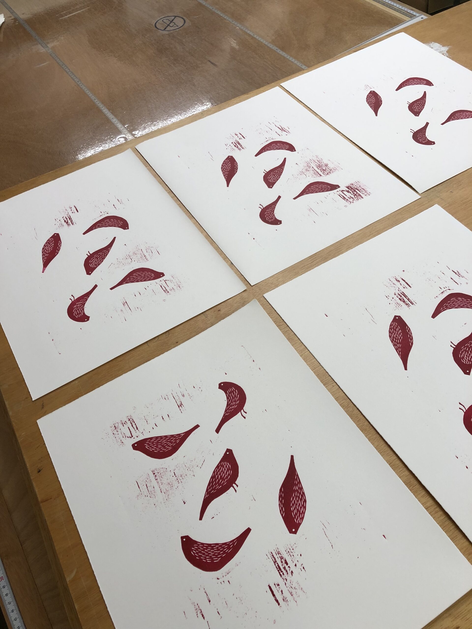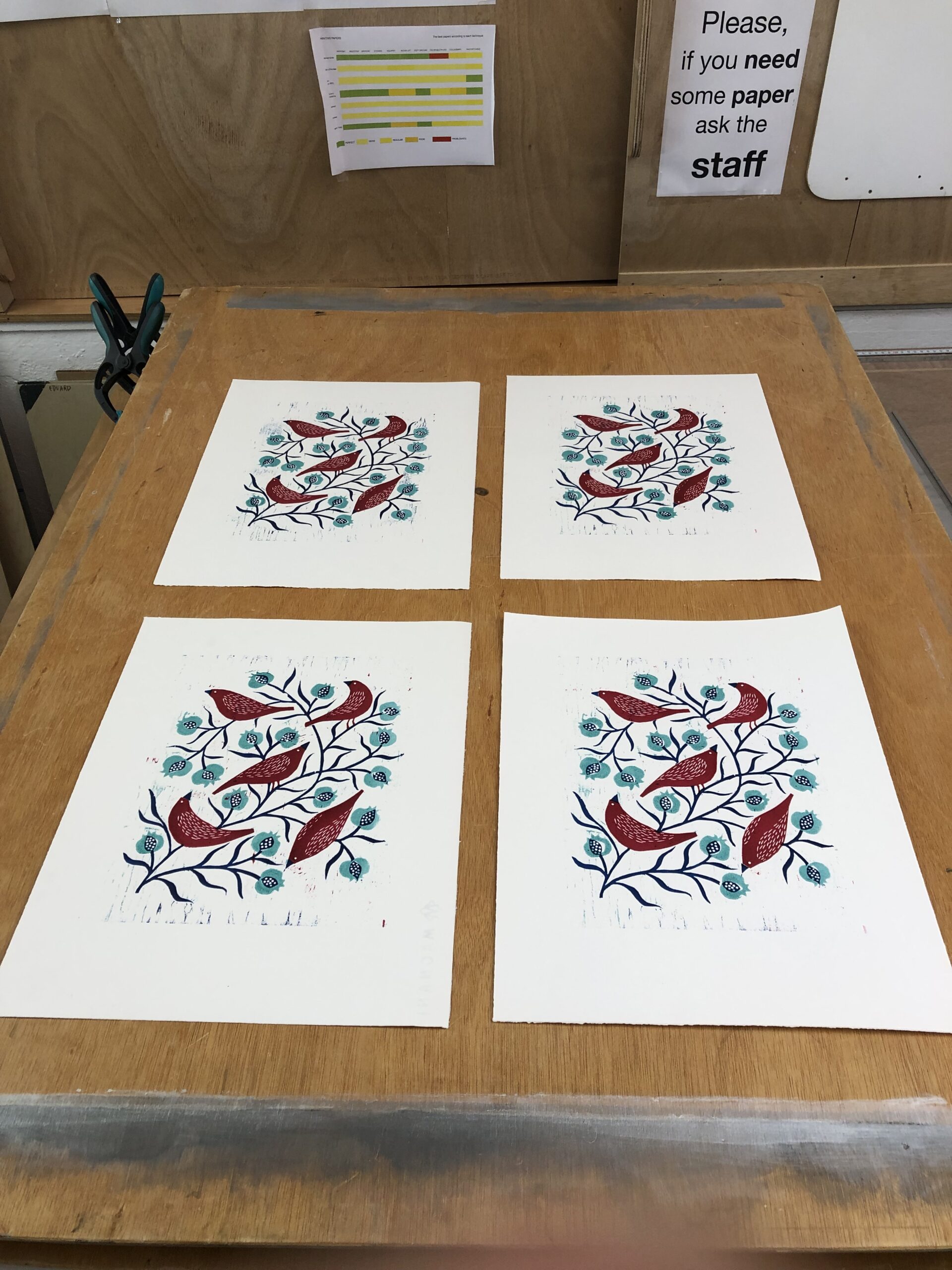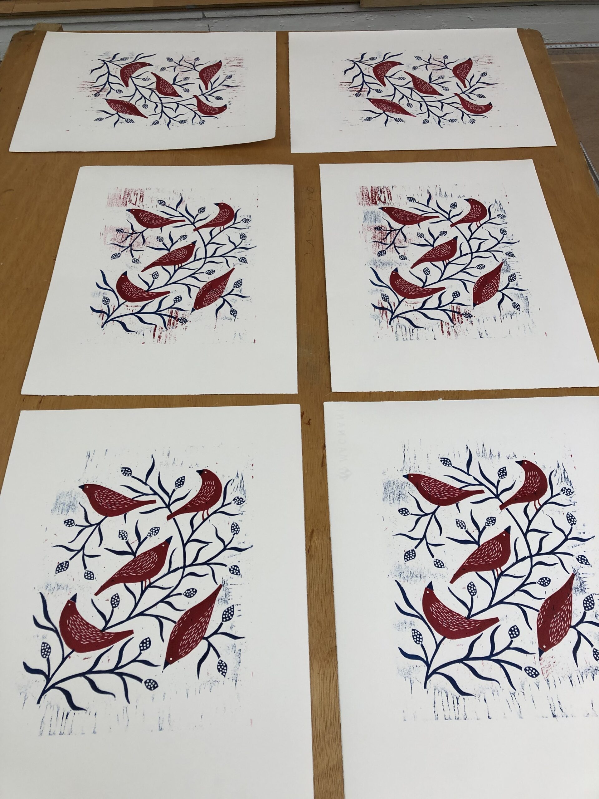 De manhã, cortei papel para dez cópias — usando a técnica de rasgado com régua que aprendi ontem, já com mais desenvoltura. Depois comecei a imprimir: primeiro o azul, com as ramagens e os bicos dos passarinhos, depois o vermelho dos corpos. O registro com papelão encaixou bem. Havia uma certa ansiedade acumulada desde os problemas de ontem, e ver as duas matrizes se alinhando foi um alívio genuíno.