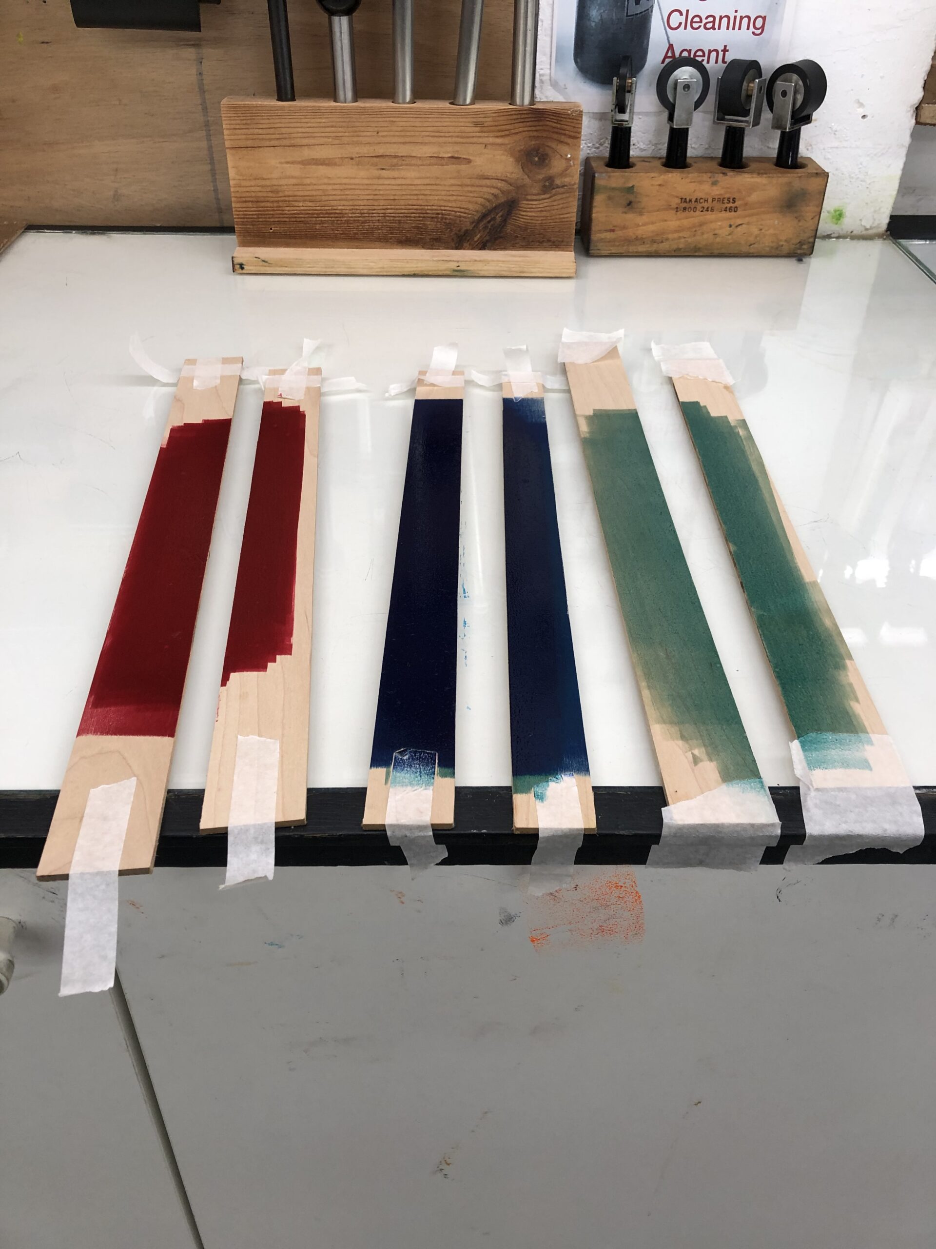 Terminei o dia limpando as áreas de impressão e guardando as tintas que sobraram em envelopes de papel manteiga — vou usá-las na próxima obra.