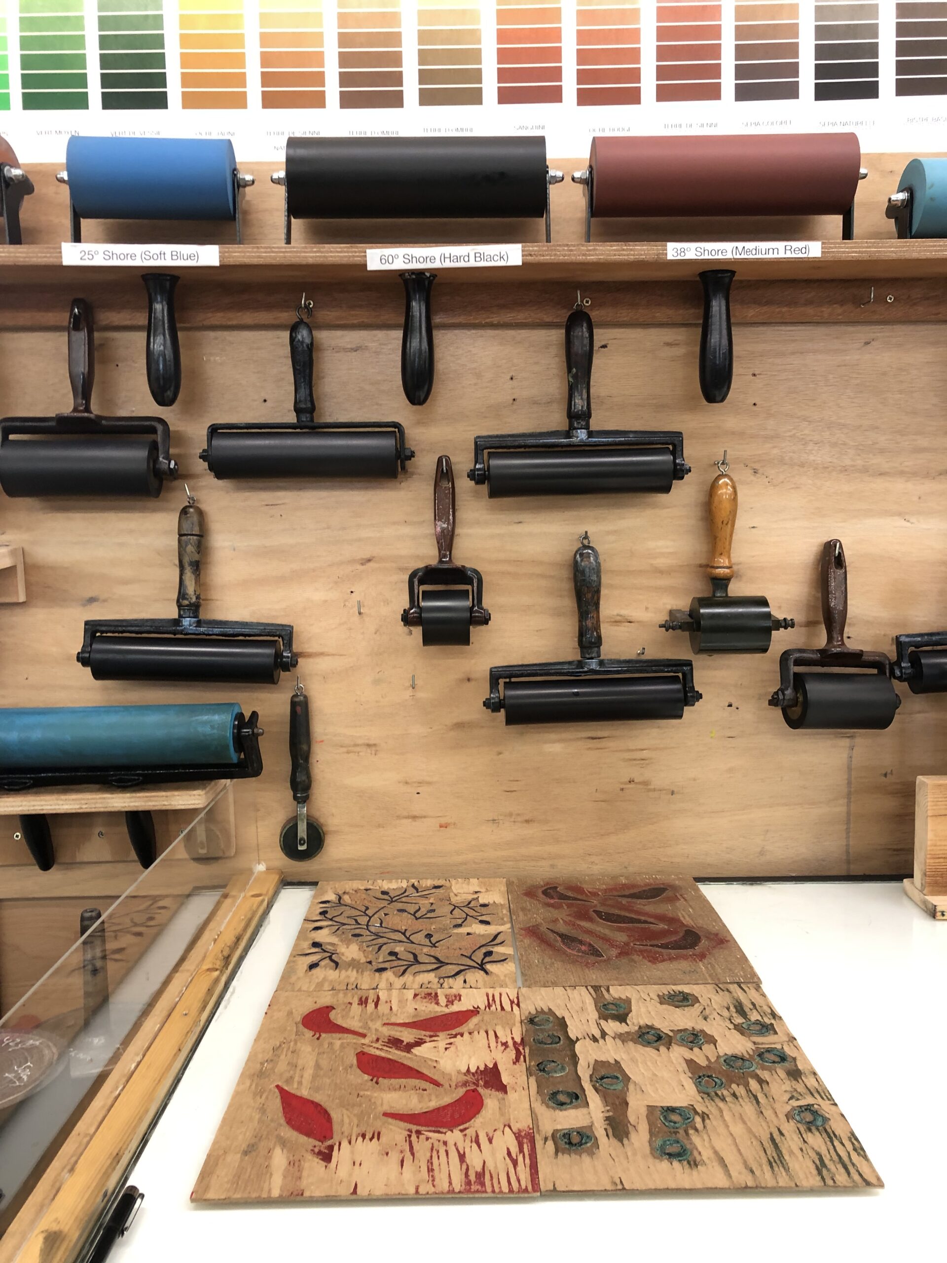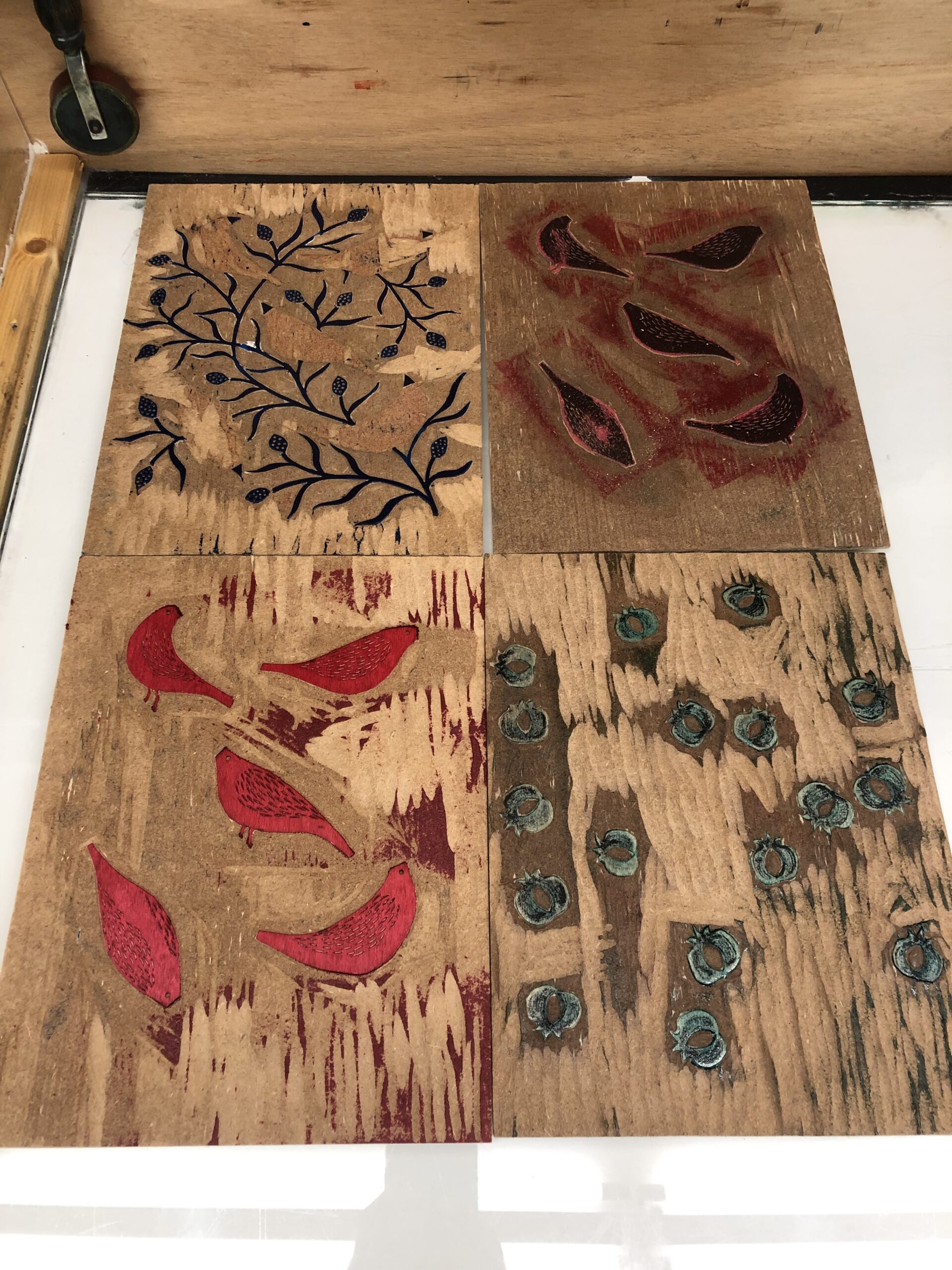 Esta foi a primeira semana da residência, e também a primeira fase: fazer uma obra do início ao fim, num território em grande parte novo para mim. Aprendi transferência com medium acrílico e fotocópia, transferência por impressão fantasma, diferentes sistemas de registro, tintas que nunca tinha usado. Além das goivas, descobri que a dremel com broca fina abre possibilidades que as ferramentas tradicionais não alcançam — e que gravar madeira é uma conversa com os materiais.